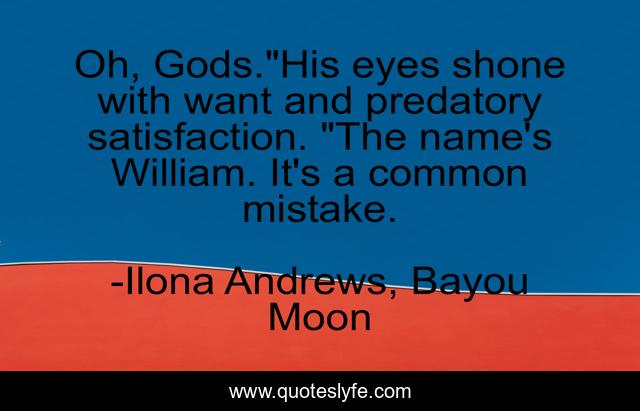 This page presents the quote "Oh, Gods."His eyes shone with want and predatory satisfaction. "The name's William. It's a common mistake.". Author of this quote is Ilona Andrews, Bayou Moon. This quote is about the-edge, ilona-andrews, arrogance, william, bayou-moon, cerise,.