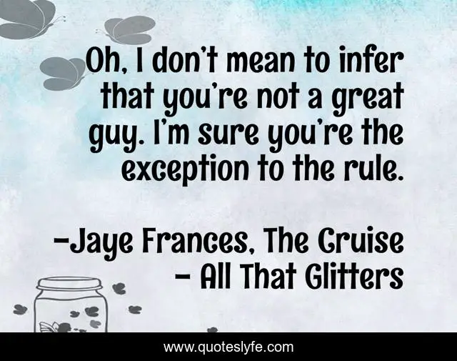 This page presents the quote "Oh, I don’t mean to infer that you’re not a great guy. I’m sure you’re the exception to the rule.". Author of this quote is Jaye Frances, The Cruise - All That Glitters. This quote is about jaye-frances, adult-ebooks, adult-humor, ebooks, satire, kindle-ebooks, all-that-glitters, the-cruise, parody,.