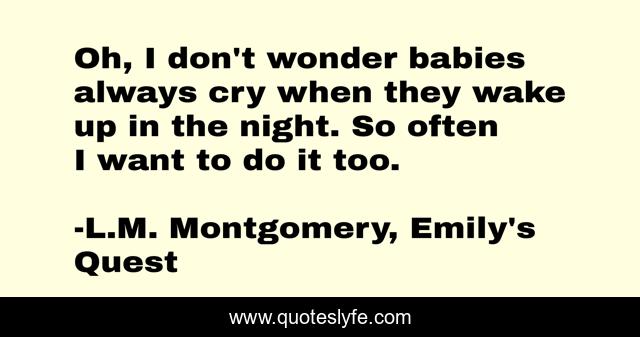 This page presents the quote "Oh, I don't wonder babies always cry when they wake up in the night. So often I want to do it too.". Author of this quote is L.M. Montgomery, Emily's Quest. This quote is about babies, crying, night,.