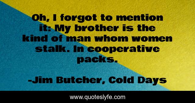 This page presents the quote "Oh, I forgot to mention it: My brother is the kind of man whom women stalk. In cooperative packs.". Author of this quote is Jim Butcher, Cold Days. This quote is about handsome, fangirling, vampire, incubus, stalking,.