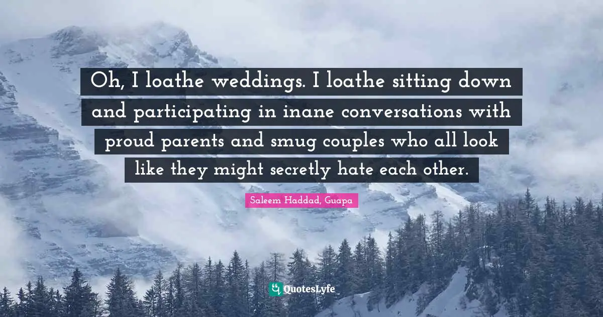 This page presents the quote "Oh, I loathe weddings. I loathe sitting down and participating in inane conversations with proud parents and smug couples who all look like they might secretly hate each other.". Author of this quote is Saleem Haddad, Guapa. This quote is about couples, facade, weddings, family, fake,.