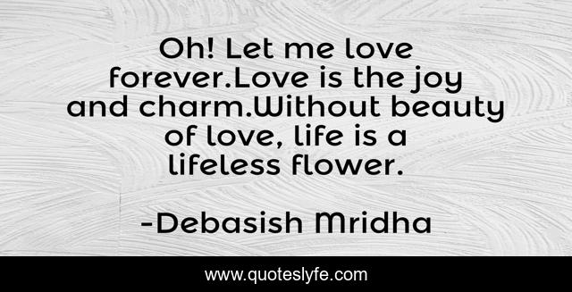 This page presents the quote "Oh! Let me love forever.Love is the joy and charm.Without beauty of love, life is a lifeless flower.". Author of this quote is Debasish Mridha. This quote is about life, love, knowledge, inspirational, intelligence, philosophy, wisdom, quotes, affection,.