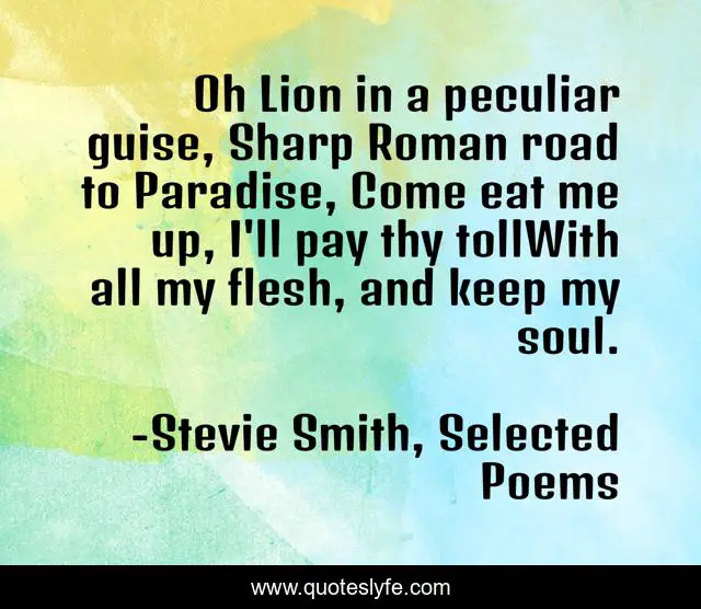This page presents the quote "Oh Lion in a peculiar guise, Sharp Roman road to Paradise, Come eat me up, I'll pay thy tollWith all my flesh, and keep my soul.". Author of this quote is Stevie Smith, Selected Poems. This quote is about martyrs, christian, christianity, lion, rome, lions, nero, martyr, christians,.
