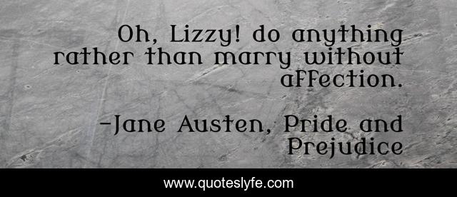 This page presents the quote "Oh, Lizzy! do anything rather than marry without affection.". Author of this quote is Jane Austen, Pride and Prejudice. This quote is about duty, love, self-determination, joy, matrimony, feelings, romance, marriage, integrity,.