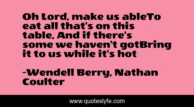 This page presents the quote "Oh Lord, make us ableTo eat all that's on this table, And if there's some we haven't gotBring it to us while it's hot". Author of this quote is Wendell Berry, Nathan Coulter. This quote is about food-blessing, prayer,.