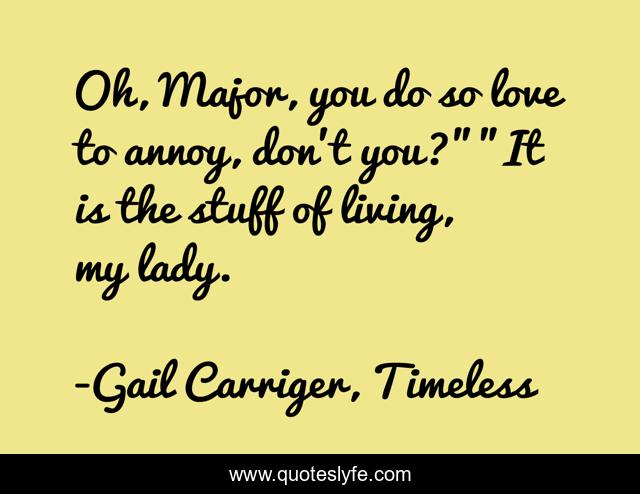 This page presents the quote "Oh, Major, you do so love to annoy, don't you?""It is the stuff of living, my lady.". Author of this quote is Gail Carriger, Timeless. This quote is about annoy, annoyance, annoys, reason, living,.