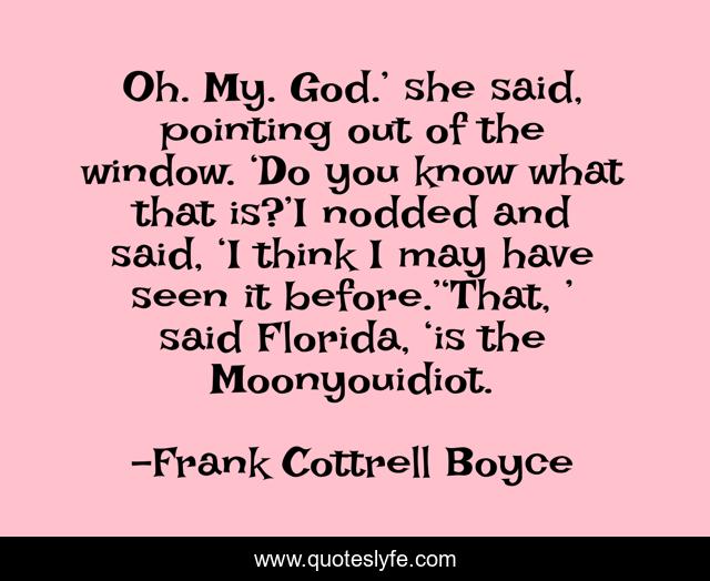 This page presents the quote "Oh. My. God.’ she said, pointing out of the window. ‘Do you know what that is?’I nodded and said, ‘I think I may have seen it before.’‘That, ’ said Florida, ‘is the Moonyouidiot.". Author of this quote is Frank Cottrell Boyce. This quote is about funny, comedy, the-moon,.