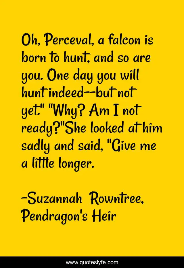 This page presents the quote "Oh, Perceval, a falcon is born to hunt, and so are you. One day you will hunt indeed--but not yet." "Why? Am I not ready?"She looked at him sadly and said, "Give me a little longer.". Author of this quote is Suzannah Rowntree, Pendragon's Heir. This quote is about pendragon-s-heir, suzannah-rowntree, king-arthur, legend, fantasy, mythology, arthurian,.