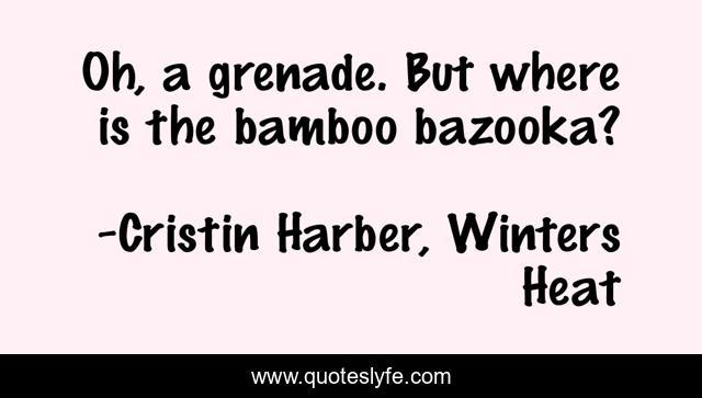 This page presents the quote "Oh, a grenade. But where is the bamboo bazooka?". Author of this quote is Cristin Harber, Winters Heat. This quote is about funny, comedy, military-romance, romantic-suspense,.