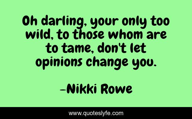 This page presents the quote "Oh darling, your only too wild, to those whom are to tame, don't let opinions change you.". Author of this quote is Nikki Rowe. This quote is about boho-girl, gypsy-girl, inspire, authentic, words-to-inspire-you, quotes, words-of-wisdom, free-spirit, free-spirited,.