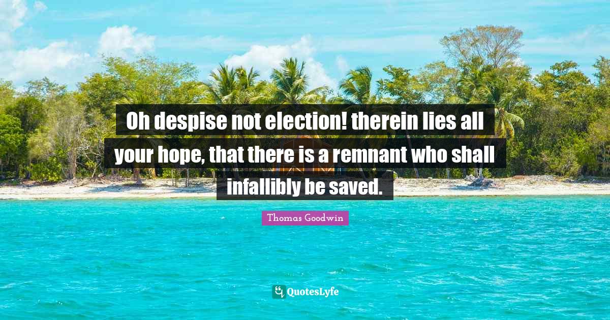 This page presents the quote "Oh despise not election! therein lies all your hope, that there is a remnant who shall infallibly be saved.". Author of this quote is Thomas Goodwin. This quote is about despise, election, hope, remnants, lying, saved,.