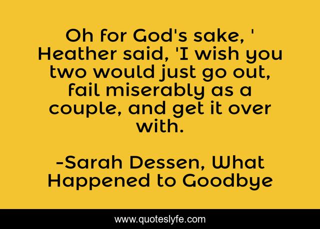 This page presents the quote "Oh for God's sake, ' Heather said, 'I wish you two would just go out, fail miserably as a couple, and get it over with.". Author of this quote is Sarah Dessen, What Happened to Goodbye. This quote is about relationships, love, couple, fail, friendship, affection,.