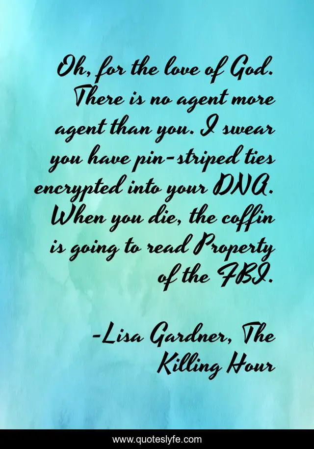 This page presents the quote "Oh, for the love of God. There is no agent more agent than you. I swear you have pin-striped ties encrypted into your DNA. When you die, the coffin is going to read Property of the FBI.". Author of this quote is Lisa Gardner, The Killing Hour. This quote is about sarcasm, fbi, humor,.