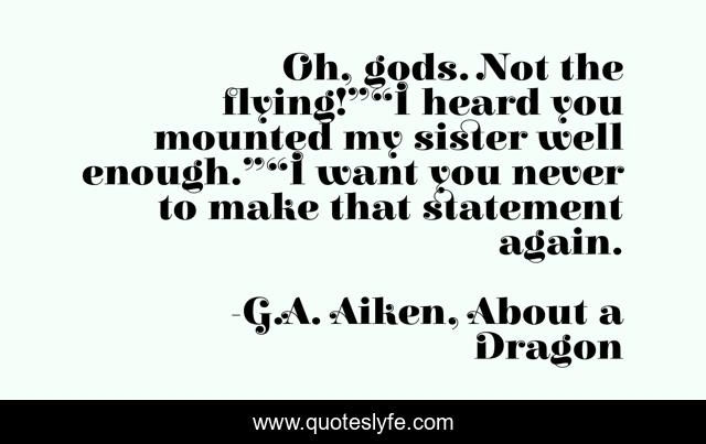 This page presents the quote "Oh, gods. Not the flying!”“I heard you mounted my sister well enough.”“I want you never to make that statement again.". Author of this quote is G.A. Aiken, About a Dragon. This quote is about sister, lovers, humor, flying, fear-of-flying, dragons,.