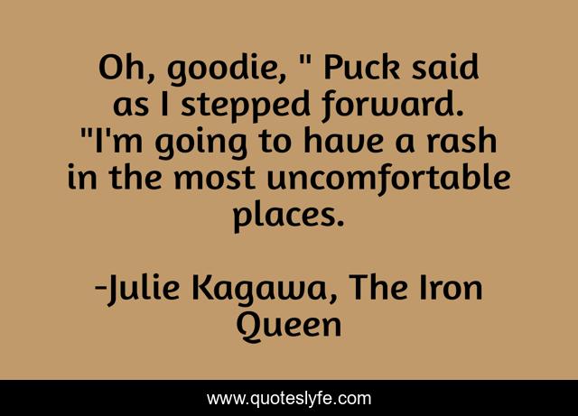 This page presents the quote "Oh, goodie, " Puck said as I stepped forward. "I'm going to have a rash in the most uncomfortable places.". Author of this quote is Julie Kagawa, The Iron Queen. This quote is about puck, humor, robin-goodfellow,.