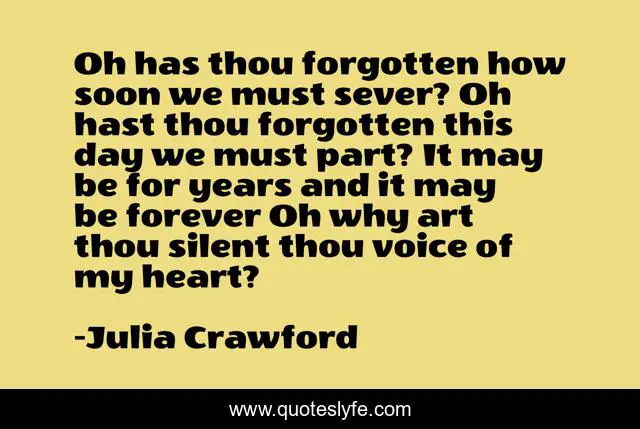 This page presents the quote "Oh has thou forgotten how soon we must sever? Oh hast thou forgotten this day we must part? It may be for years and it may be forever Oh why art thou silent thou voice of my heart?". Author of this quote is Julia Crawford. .