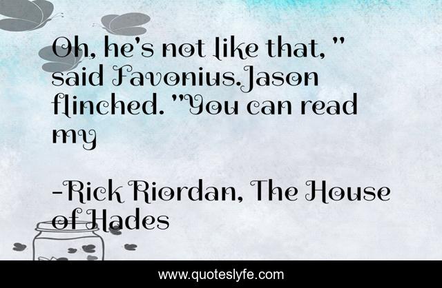 This page presents the quote "Oh, he's not like that, " said Favonius.Jason flinched. "You can read my". Author of this quote is Rick Riordan, The House of Hades. This quote is about jason-grace, favonius, percy-jackson, rick-riordan, nico-di-angelo, cupid, heroes-of-olympus, house-of-hades, eros,.