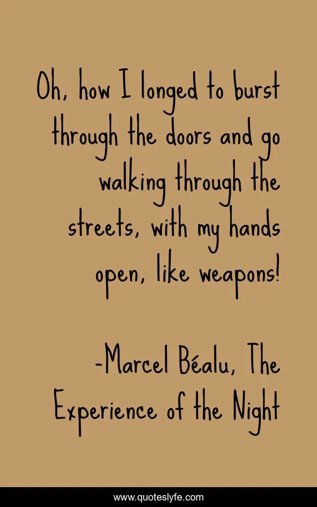 This page presents the quote "Oh, how I longed to burst through the doors and go walking through the streets, with my hands open, like weapons!". Author of this quote is Marcel Béalu, The Experience of the Night. This quote is about silly, revenge, frustration, hilarious,.