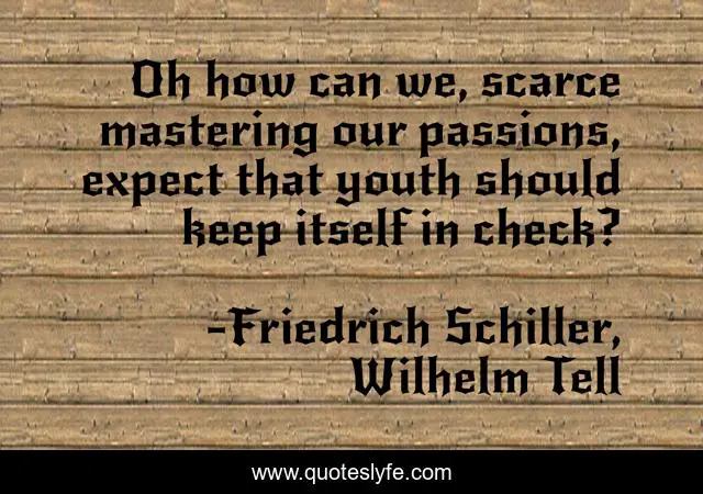 This page presents the quote "Oh how can we, scarce mastering our passions, expect that youth should keep itself in check?". Author of this quote is Friedrich Schiller, Wilhelm Tell. This quote is about youth, restraint, passion,.