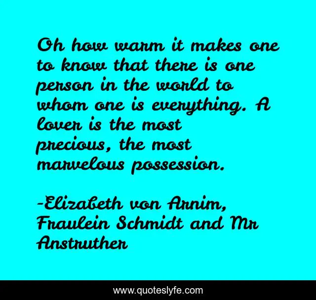 This page presents the quote "Oh how warm it makes one to know that there is one person in the world to whom one is everything. A lover is the most precious, the most marvelous possession.". Author of this quote is Elizabeth von Arnim, Fraulein Schmidt and Mr Anstruther. .