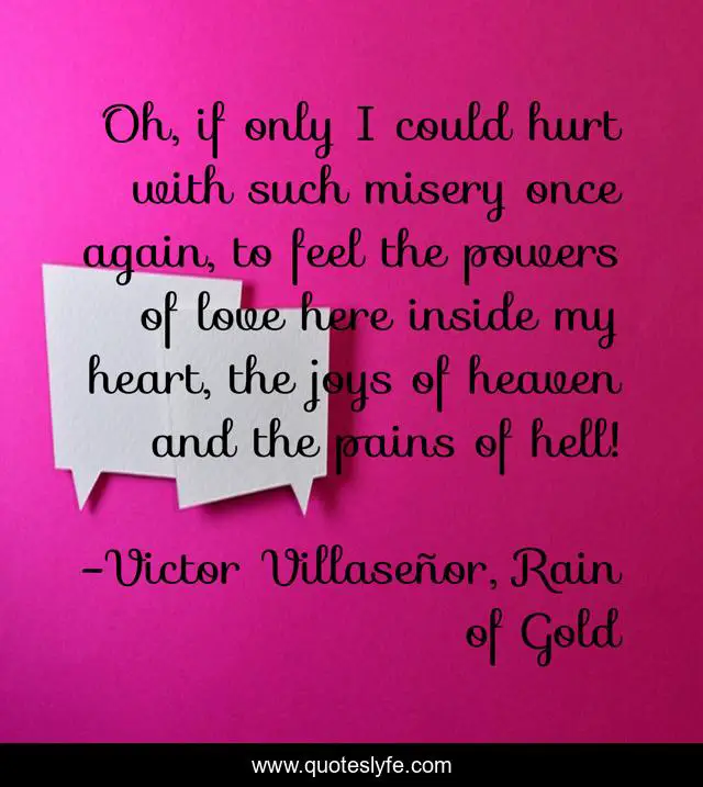 This page presents the quote "Oh, if only I could hurt with such misery once again, to feel the powers of love here inside my heart, the joys of heaven and the pains of hell!". Author of this quote is Victor Villaseñor, Rain of Gold. This quote is about joy, longing, love, affection, pain,.