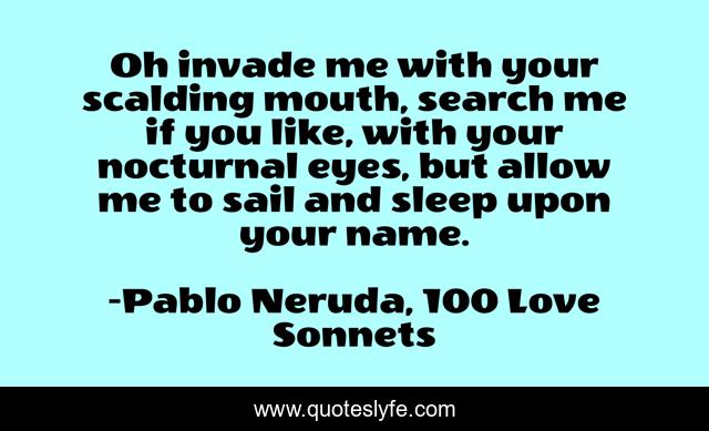 This page presents the quote "Oh invade me with your scalding mouth, search me if you like, with your nocturnal eyes, but allow me to sail and sleep upon your name.". Author of this quote is Pablo Neruda, 100 Love Sonnets. This quote is about love, passionate, passion, love-poetry, affection,.