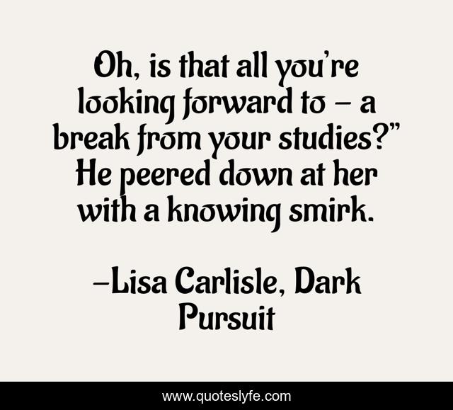 This page presents the quote "Oh, is that all you’re looking forward to - a break from your studies?” He peered down at her with a knowing smirk.". Author of this quote is Lisa Carlisle, Dark Pursuit. This quote is about art, vampire, shifter, urban-fantasy-holiday-romance, christmas-paranormal-romance, chateau,.