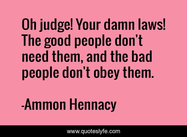 This page presents the quote "Oh judge! Your damn laws! The good people don't need them, and the bad people don't obey them.". Author of this quote is Ammon Hennacy. This quote is about law, courts, laws,.
