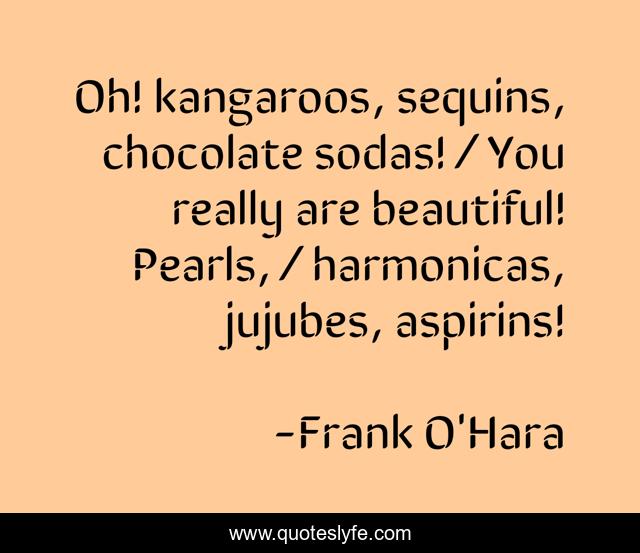 This page presents the quote "Oh! kangaroos, sequins, chocolate sodas! / You really are beautiful! Pearls, / harmonicas, jujubes, aspirins!". Author of this quote is Frank O'Hara. .