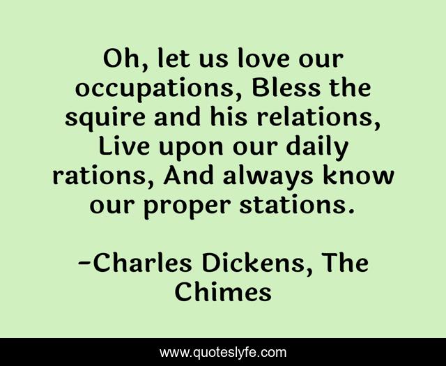 This page presents the quote "Oh, let us love our occupations, Bless the squire and his relations, Live upon our daily rations, And always know our proper stations.". Author of this quote is Charles Dickens, The Chimes. This quote is about life, life-and-living,.