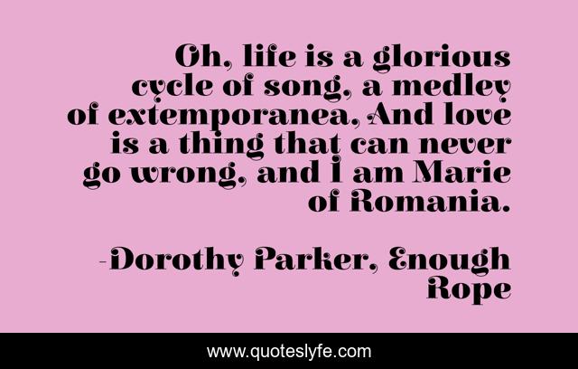 This page presents the quote "Oh, life is a glorious cycle of song, a medley of extemporanea, And love is a thing that can never go wrong, and I am Marie of Romania.". Author of this quote is Dorothy Parker, Enough Rope. .