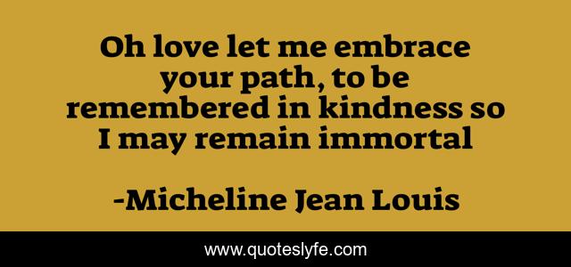 This page presents the quote "Oh love let me embrace your path, to be remembered in kindness so I may remain immortal". Author of this quote is Micheline Jean Louis. This quote is about love, philosophy, immortal, immortality, life-philosophy, affection,.