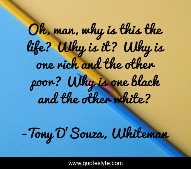 This page presents the quote "Oh, man, why is this the life? Why is it? Why is one rich and the other poor? Why is one black and the other white?". Author of this quote is Tony D'Souza, Whiteman. This quote is about race, poverty,.