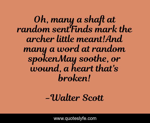 This page presents the quote "Oh, many a shaft at random sentFinds mark the archer little meant!And many a word at random spokenMay soothe, or wound, a heart that's broken!". Author of this quote is Walter Scott. .