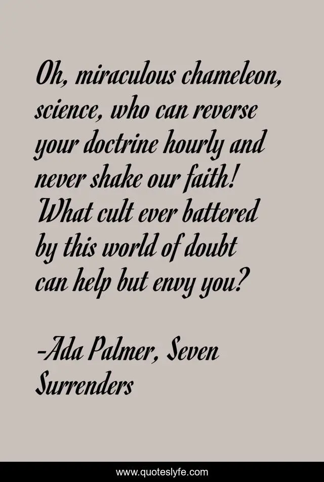 This page presents the quote "Oh, miraculous chameleon, science, who can reverse your doctrine hourly and never shake our faith! What cult ever battered by this world of doubt can help but envy you?". Author of this quote is Ada Palmer, Seven Surrenders. .