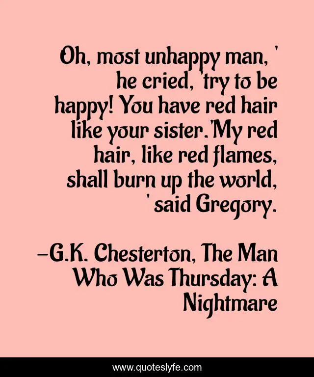 This page presents the quote "Oh, most unhappy man, ' he cried, 'try to be happy! You have red hair like your sister.'My red hair, like red flames, shall burn up the world, ' said Gregory.". Author of this quote is G.K. Chesterton, The Man Who Was Thursday: A Nightmare. This quote is about red-hair, anarchy,.