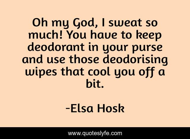 This page presents the quote "Oh my God, I sweat so much! You have to keep deodorant in your purse and use those deodorising wipes that cool you off a bit.". Author of this quote is Elsa Hosk. This quote is about god, sweat,.