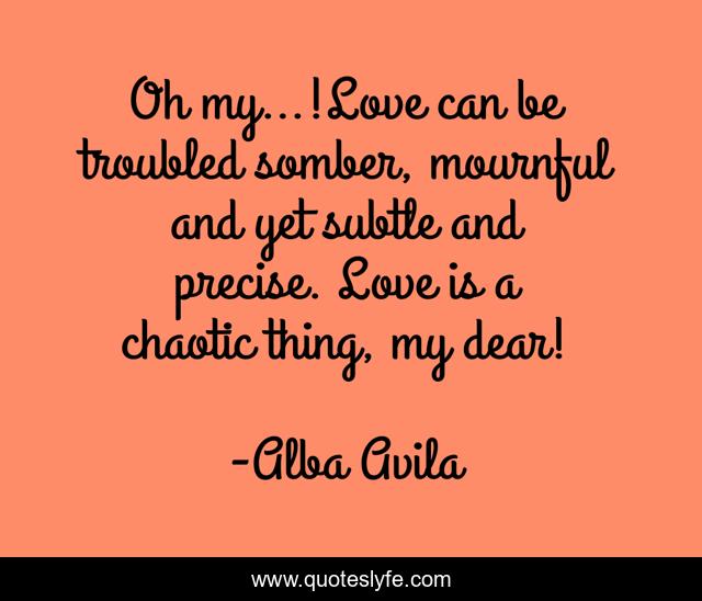 This page presents the quote "Oh my…!Love can be troubled somber, mournful and yet subtle and precise. Love is a chaotic thing, my dear!". Author of this quote is Alba Avila. This quote is about heart, art, love, inspirational, world, amor, life, poetry, emotions,.