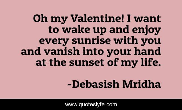 This page presents the quote "Oh my Valentine! I want to wake up and enjoy every sunrise with you and vanish into your hand at the sunset of my life.". Author of this quote is Debasish Mridha. This quote is about valentine-s-day, miraboli, philosophy, declaration-of-love, love, oscar-wilde, sunset-of-my-life, debasish-mridha, quotes,.