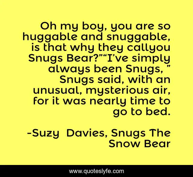 This page presents the quote "Oh my boy, you are so huggable and snuggable, is that why they callyou Snugs Bear?”“I’ve simply always been Snugs, ” Snugs said, with an unusual, mysterious air, for it was nearly time to go to bed.". Author of this quote is Suzy Davies, Snugs The Snow Bear. This quote is about bears, children-s-books, animals, children-s-fiction,.