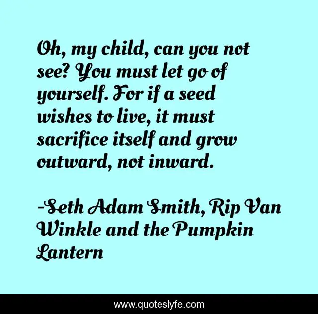 This page presents the quote "Oh, my child, can you not see? You must let go of yourself. For if a seed wishes to live, it must sacrifice itself and grow outward, not inward.". Author of this quote is Seth Adam Smith, Rip Van Winkle and the Pumpkin Lantern. This quote is about gardening, sacrifice, gardening-as-therapy, selflessness, growth, selfishness, seed,.