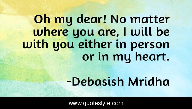 This page presents the quote "Oh my dear! No matter where you are, I will be with you either in person or in my heart.". Author of this quote is Debasish Mridha. This quote is about promises, i-will-be-with-you, philosophy, in-my-heart, quotes, debasish-mridha-md, inspirational, prayer, debasish-mridha,.