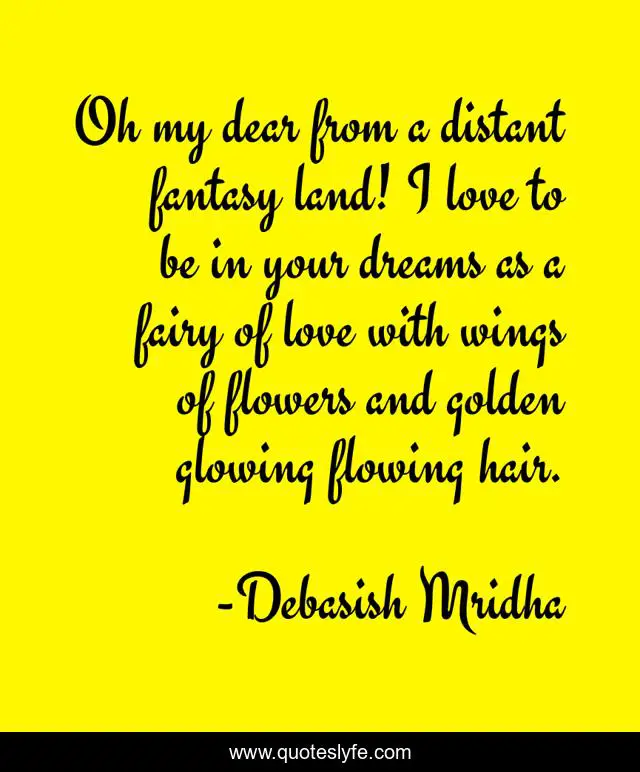 This page presents the quote "Oh my dear from a distant fantasy land! I love to be in your dreams as a fairy of love with wings of flowers and golden glowing flowing hair.". Author of this quote is Debasish Mridha. This quote is about philosophy, debasish-mridha, fairytales, quotes, debasish-mridha-md, inspirational, i-love-to-be-in-your-dreams, enthusiasm, in-love,.
