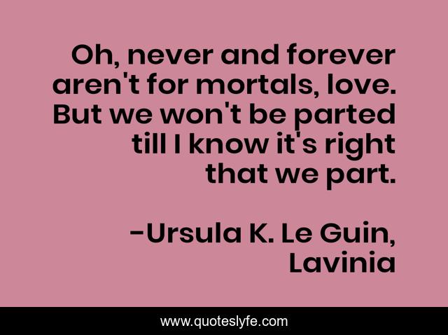 This page presents the quote "Oh, never and forever aren't for mortals, love. But we won't be parted till I know it's right that we part.". Author of this quote is Ursula K. Le Guin, Lavinia. This quote is about enthusiasm, mythology, inspirational, parting,.
