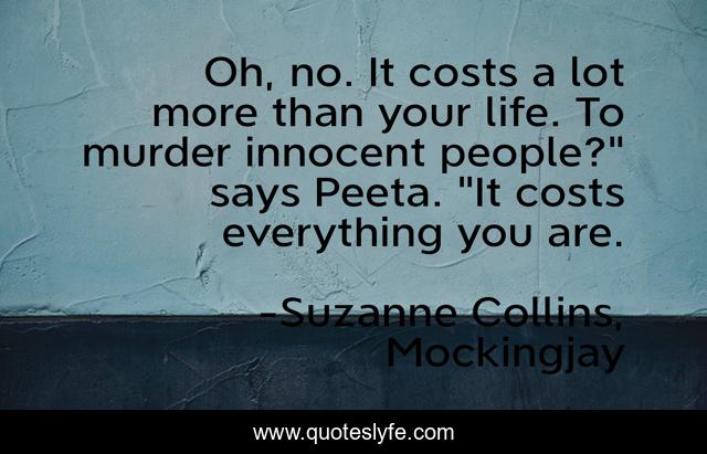 This page presents the quote "Oh, no. It costs a lot more than your life. To murder innocent people?" says Peeta. "It costs everything you are.". Author of this quote is Suzanne Collins, Mockingjay. This quote is about murder, morality,.