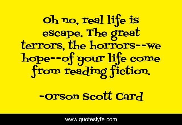This page presents the quote "Oh no, real life is escape. The great terrors, the horrors--we hope--of your life come from reading fiction.". Author of this quote is Orson Scott Card. This quote is about escapism, on-fiction, fiction,.