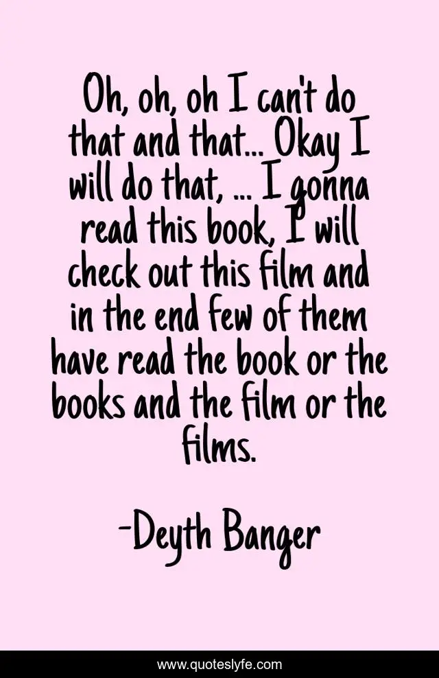 This page presents the quote "Oh, oh, oh I can't do that and that... Okay I will do that, ... I gonna read this book, I will check out this film and in the end few of them have read the book or the books and the film or the films.". Author of this quote is Deyth Banger. This quote is about lie, okay, oh, books, liars, films, book, film,.