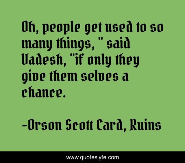 This page presents the quote "Oh, people get used to so many things, " said Vadesh, "if only they give them selves a chance.". Author of this quote is Orson Scott Card, Ruins. This quote is about human-nature, philosophical, habits, robots, thrill,.