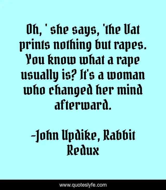 This page presents the quote "Oh, ' she says, 'the Vat prints nothing but rapes. You know what a rape usually is? It's a woman who changed her mind afterward.". Author of this quote is John Updike, Rabbit Redux. This quote is about rape, 1970,.