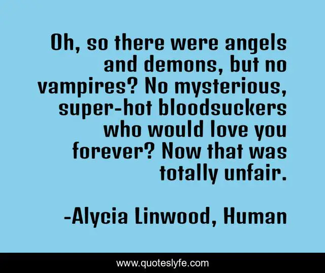 This page presents the quote "Oh, so there were angels and demons, but no vampires? No mysterious, super-hot bloodsuckers who would love you forever? Now that was totally unfair.". Author of this quote is Alycia Linwood, Human. This quote is about funny, comedy, vampires,.